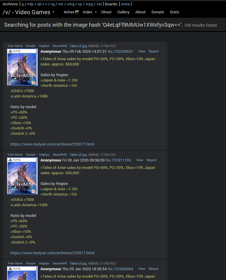 >Tales of Arise sales by model PS=60%, PC=30%, Xbox=10% Japan sales: approx. 650,000Sales by Region>Japan & Asia ~1.2M>North America ~1M>EMEA >700k>Latin America <100kRatio by model>PS <60%>PC <30%>Xbox >10%>Switch <0%>Switch 2 <0%https://www.mutyun.com/archives/225577.html