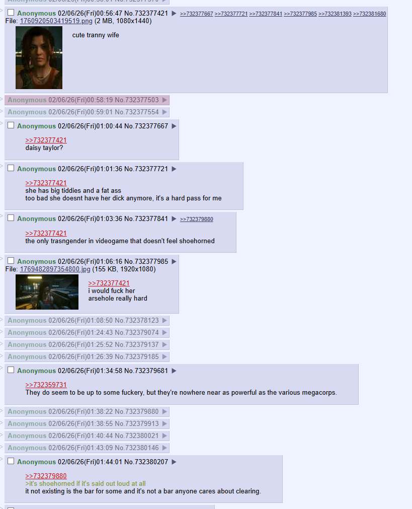 >>732391837There's 2 more trannies in the game by the way, a game where you can literally get a new body outright if not cybernetic genitalia. And there's 3 current-year tranners, falceto voices included.Also you're not woke, you're pozzed braindead and a slave. Wokies at least stand behind their dogma, you're brain fog on 2 legs.