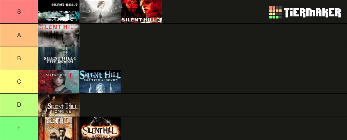 >>732345629you have pretty accurate rating i might put remake in A tier but its great still, an i been silent hill fan since 2002