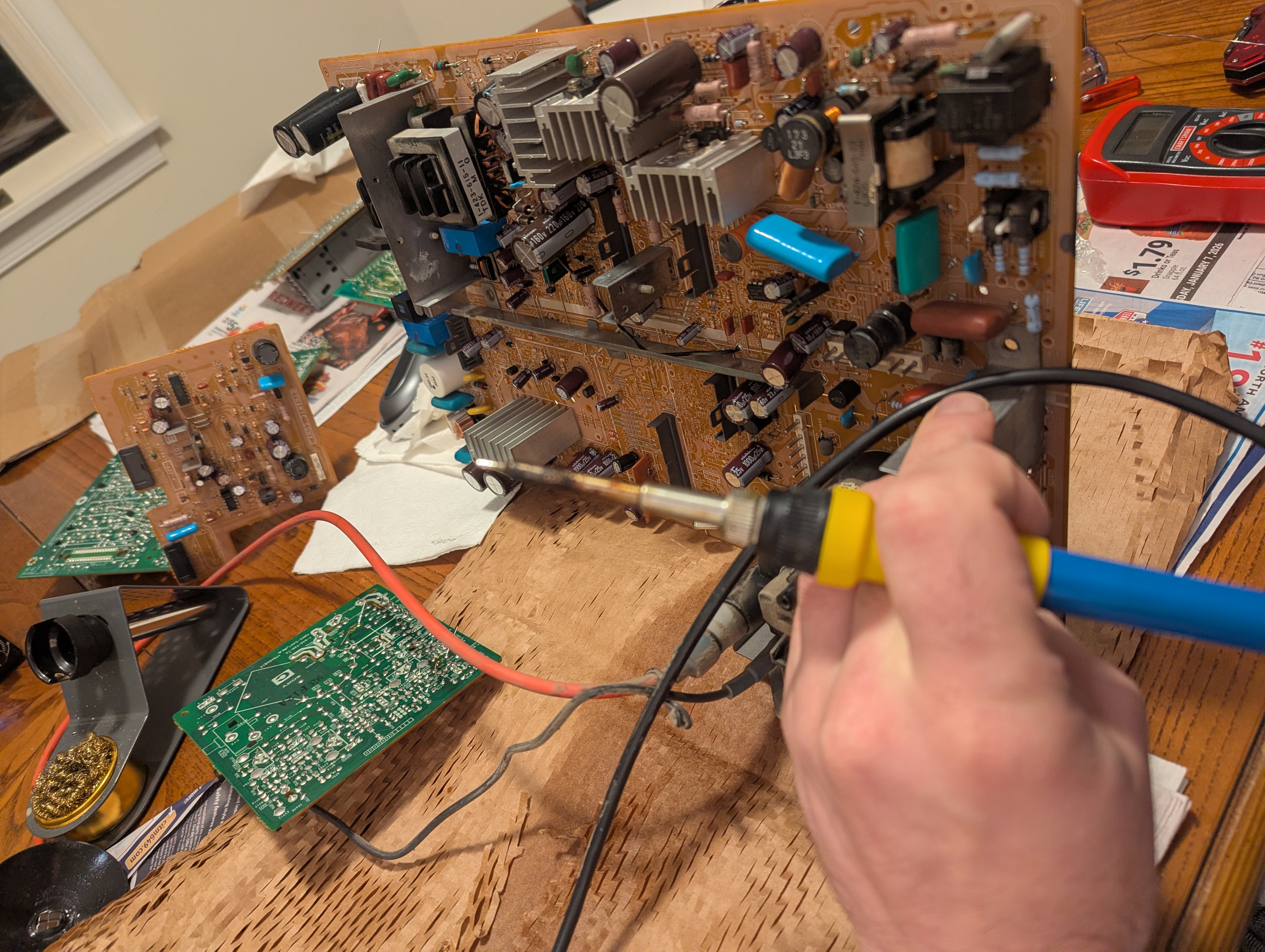 >>732352998I just finished recapping my hand-me-down 32" Sony I grew up with. boards are still disassembled, so today i'm gonna reassemble and test to make sure I didn't fuck it up, then do an RGB mod after.It's not that easy. Disassembly is complicated, then you have to go through and catalogue all the caps. Then you have to find and order appropriate replacements. Then you have to actually recap a fuckton, and removing the old ones can be a pain even with a desoldering gun. Then reassembly and testing, and iif you screwed anything up its exponentially more work to identify the issue. All for a niche hobby with not a lot of buyers, for something so heavy and bulky that it'd need to be localNot exactly easy money