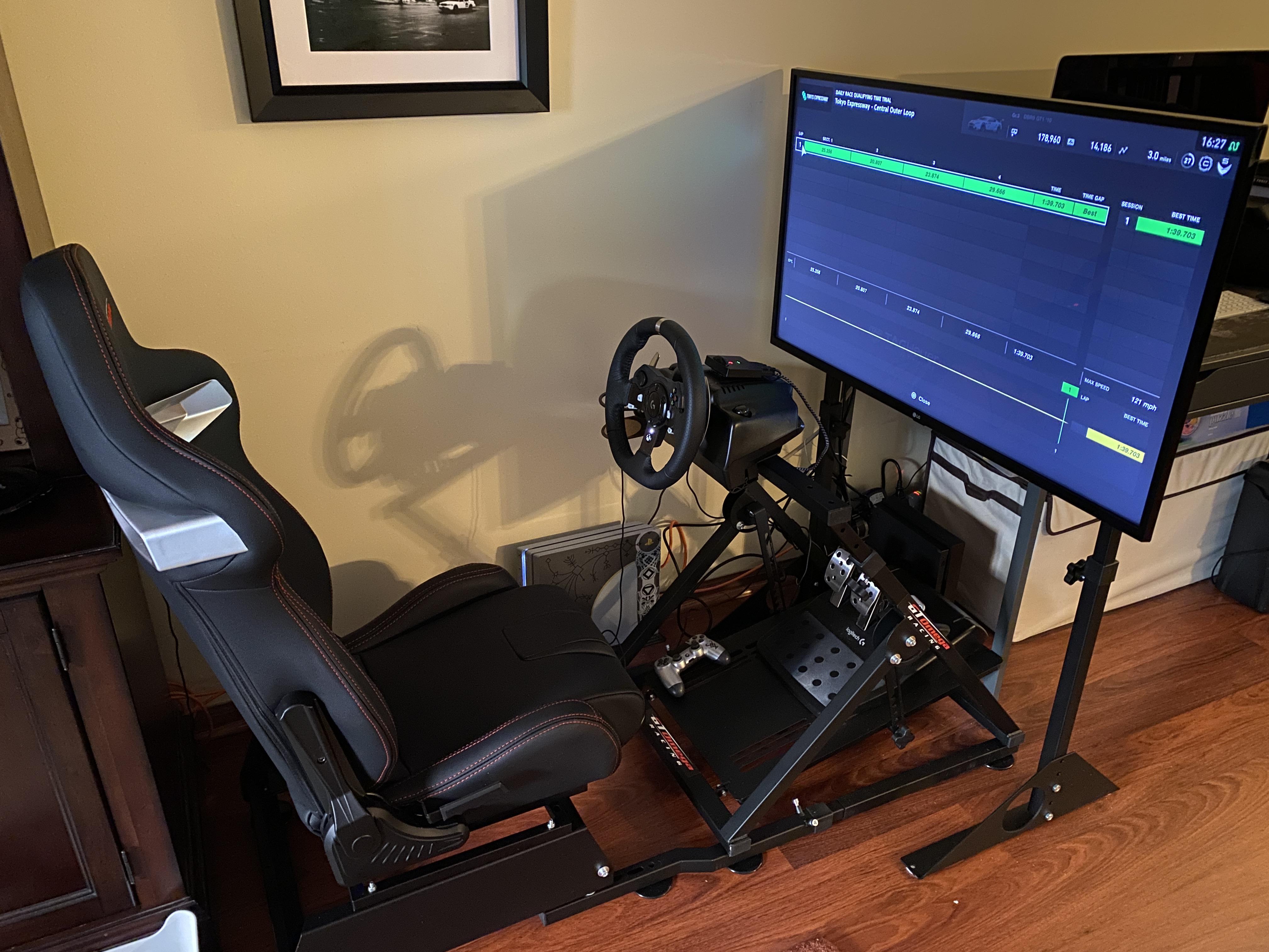 Or just be a cheap-ass like me with a home-made wheel stand out of scrap wood that's more than strong enough to hold a wheel and pedals, combined with my office chair, and a Quest 2 for VR wireless driving, since I can't afford a decent triple-screen setup to have the same effect.