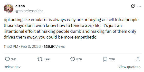 I've heard it said that stupidity isn't a failure to know but a refusal to learn. I didn't know how to run emulators when I was 14, I didn't understand things like mounting isos or finding bios files, but these are problems that are solved with a simple search. If anything it should be easier than ever, if there's one thing AI is (supposedly) good for it's answering simple questions like this.