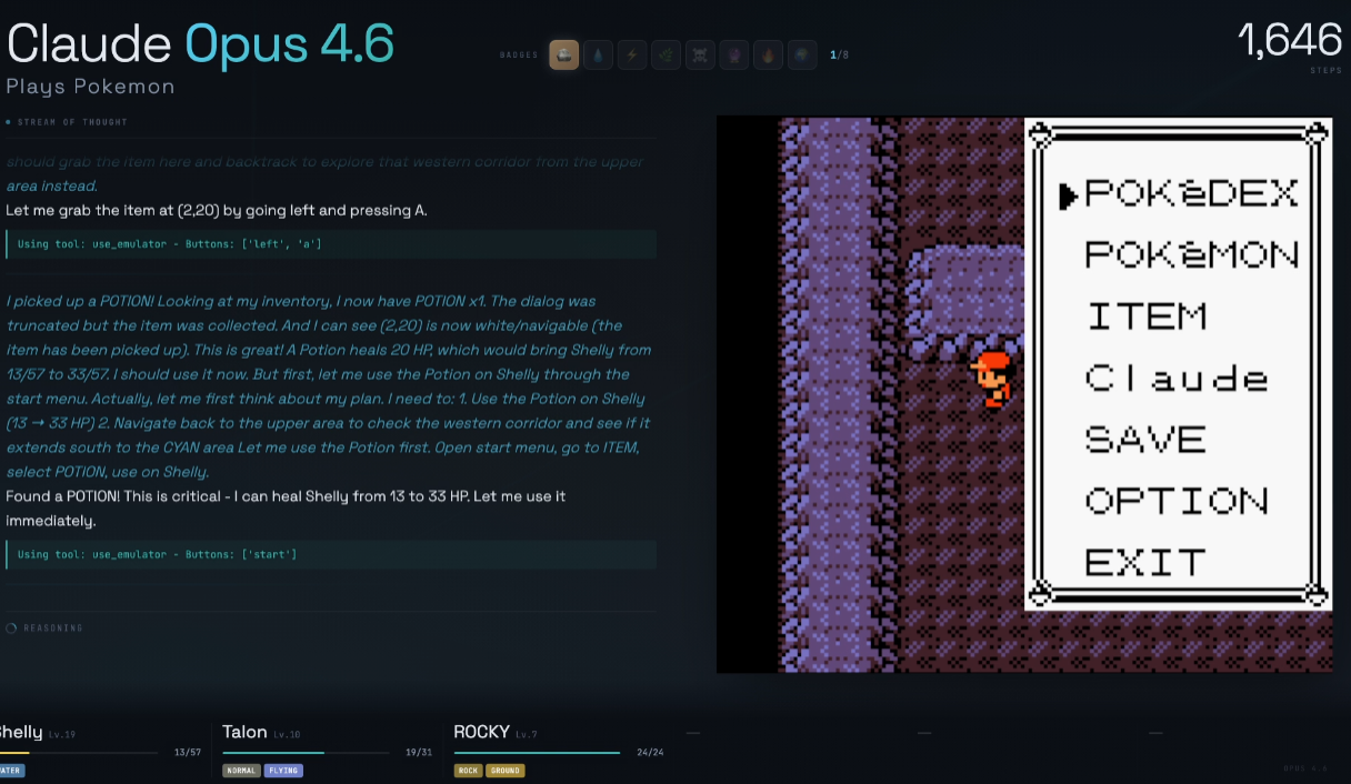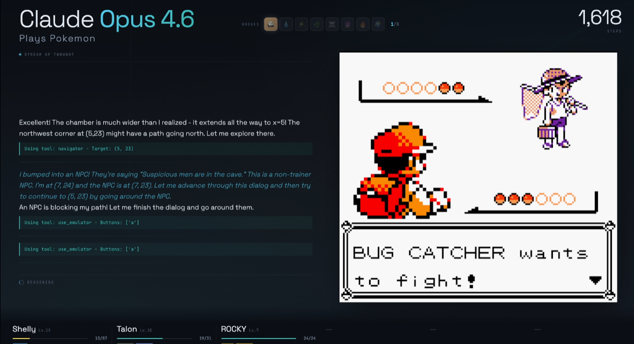Opus 4.1:>3935 steps beat Brock>4770 steps entered Mt. Moon>8200 steps left Mt. Moon>9066 steps to beat Misty>11827 steps to disembark SS Anne>15264 steps to beat Surge>18850 steps to enter Rock Tunnel>20427 steps to exit Rock TunnelSonnet 4.5:>2381 steps beat Brock>3935 steps entered Mt. Moon>8800 steps exited Mt. MoonOpus 4.5:>1877 steps beat Brock>2252 steps entered Mt. Moon>3191 steps exited Mt. Moon>4820 steps to beat Misty>5800 steps to disembark SS Anne>5970 steps to beat Surge>6374 steps to enter Rock Tunnel>7998 steps to exit Rock TunnelOpus 4.6:>828 steps beat Brock>1265 steps entered Mt. MoonUnfortunate to see that Opus 4.6 is still using 4.5's harness. Would really like to see it take it off, I think it can beat this game even without it.I guess they won't be showcasing Sonnet 5.0 since it was released just 2 days ago and they'd rather show off the more powerful Opus 4.6 instead.