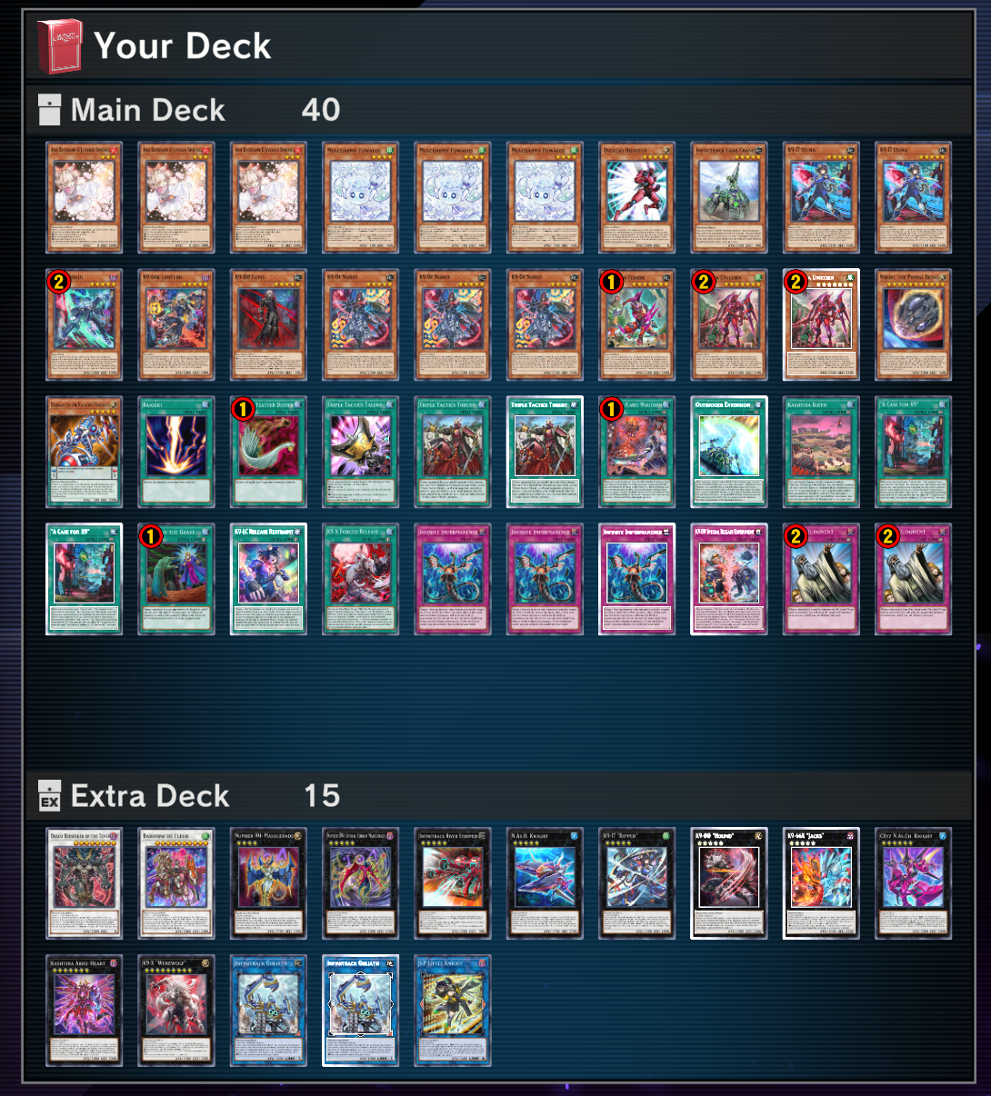 I just ripped it from trif's stream earlier but if you go to 3:20:00 in the most recent vod he explains the combo. the TLDR is that all of your shining sarc stuff are both free special summons and extenders that make you a dragoon with dark magician of destruction and gandora as a Raigeki push going second or as a body to make baronne with a yummy synchro, any two monsters equal camellia into hornet drones for full yummy combo