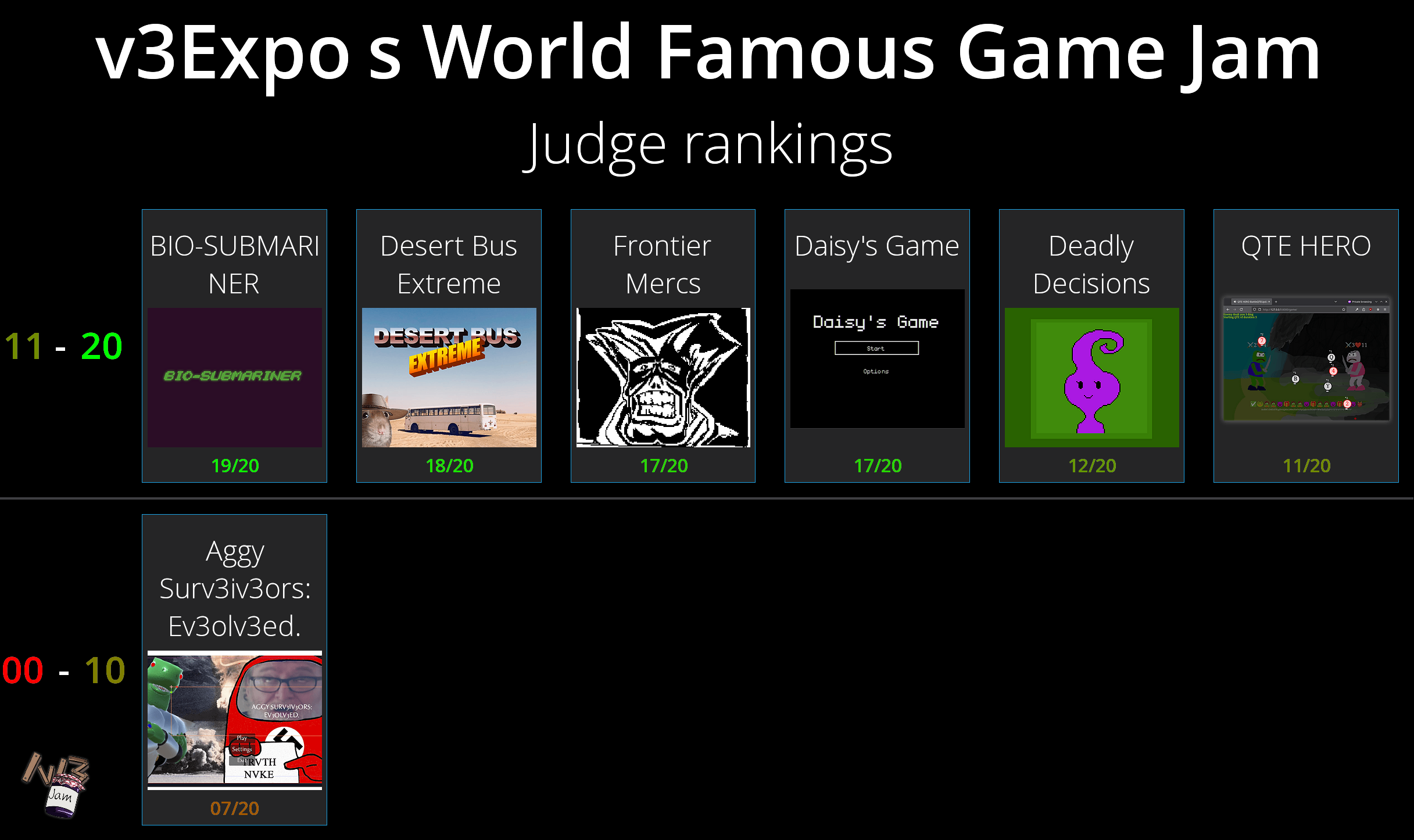 The /v/3 jam is OVER! Now it's time for (you) to play them and vote on which one should win our $100 prize! https://itch.io/jam/v3jam/entriesAnd in an hour and 20 minutes, myself and Brim will be hosting a Livestream as we go through all the entrants and give our judge ranking. Come have fun, whine about muh rigging and enjoy a comfy stream! https://youtube.com/@v3expo