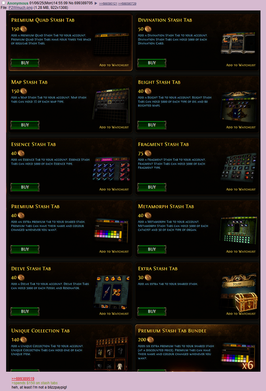 >>732508236>And does this eliminate the need for those additional purchases?You will find just like in a trade league, that having extra storage is very very helpful in SSF. Much like how I could sell items with a premium tab, I would need to store those same valuable items for my current build or future builds in SSF. Part of this game is juggling attributes on items and you may need to keep good items with good stats in case you need it in the future. Like you may need a few extra tabs for a few spare rings, amulets, and so on.
