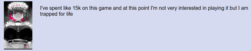 legitimately mentally ill. It's like the same retards who buy nikke's $60 costumes, complain about how shit it is, then continue to buy the next one