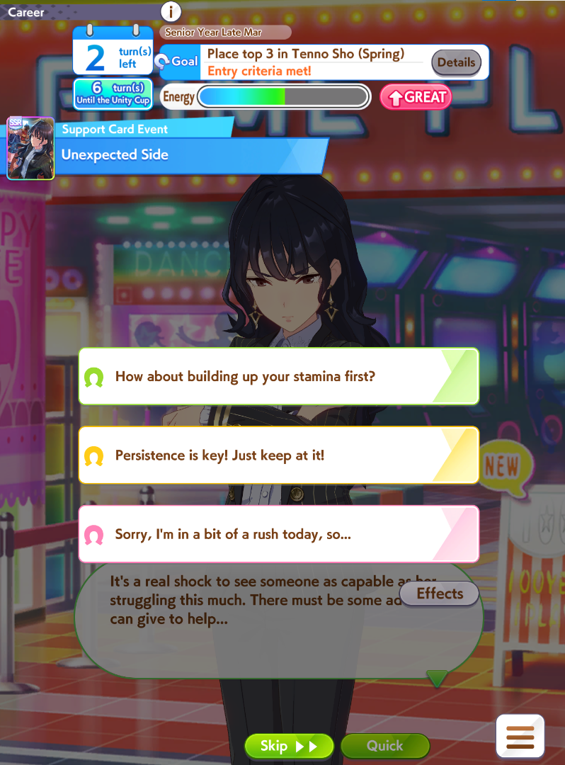 I remember you guys giving me a ton of tips for improving my Fuji ace for this CM, I wanted to go back to the drawing board and try to improve her but I physically haven't had the time, my life has been a roller coaster lately. What I wanted to ask is, would you guys say it's worth it to still try? She lacks stuff like Head-on (rng) and MM (rng or card) which at this point I don't even know if it's worth it to even try to chase, everyone has moved on to Dirt already