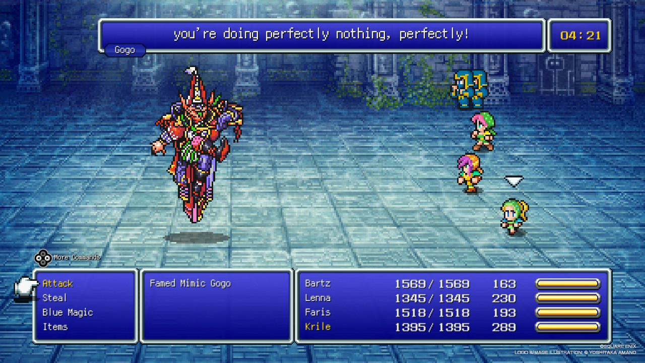 >>732569340>FFV Pixel RemasterProbably an 8.5/10, I'm about to head into Interdimensional Rift AFAIK but may do some grinding beforehand. First time playing this one.