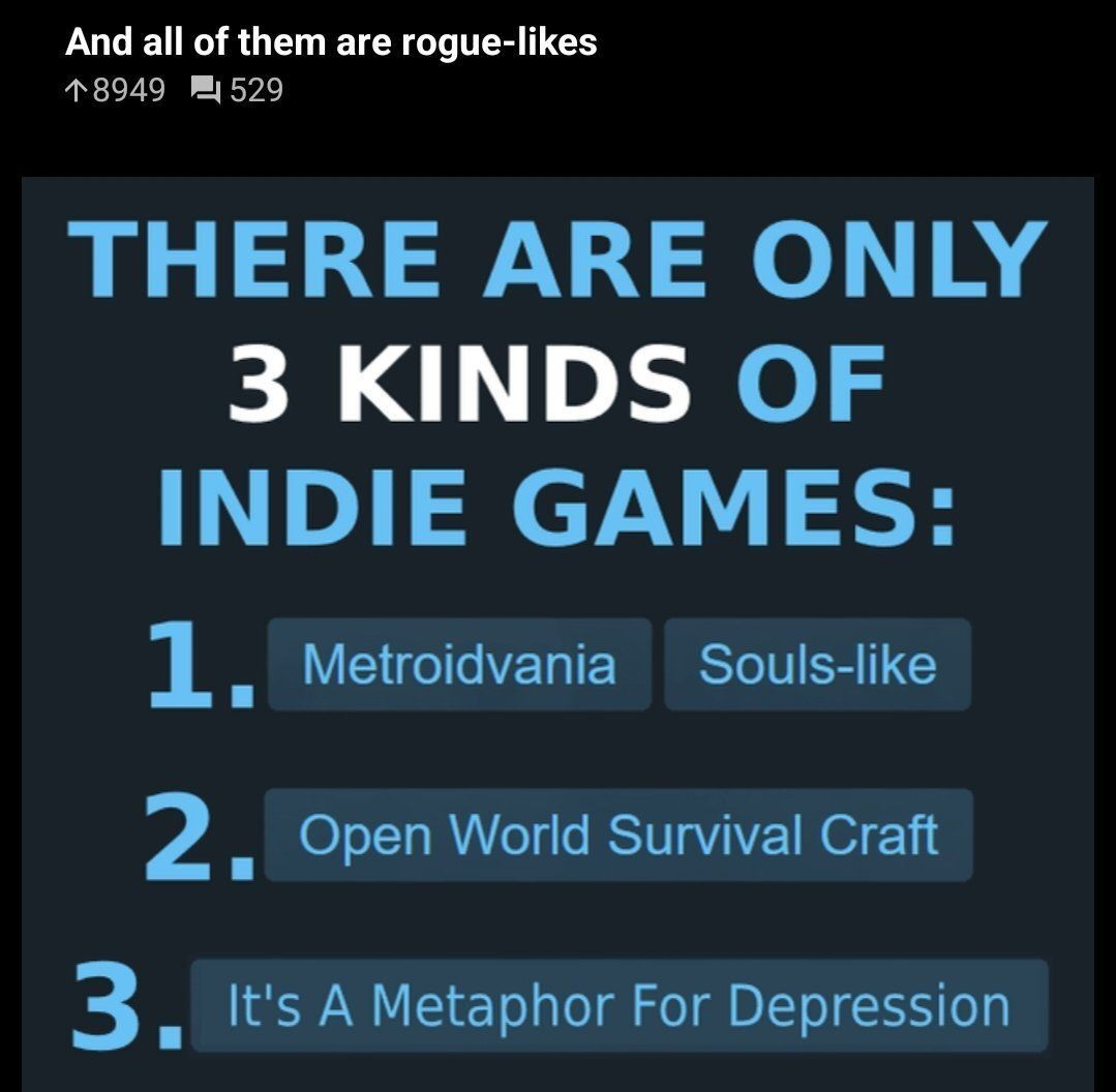 >metroidvania>souls-likeAka ludo kino and gaming in its purest form. /v/ complains about shallow gameplay slop from AAA developers but when indie studios deliver massive amounts of challenging games catering to many different tastes you guys aren't happy either.What do you guys want?