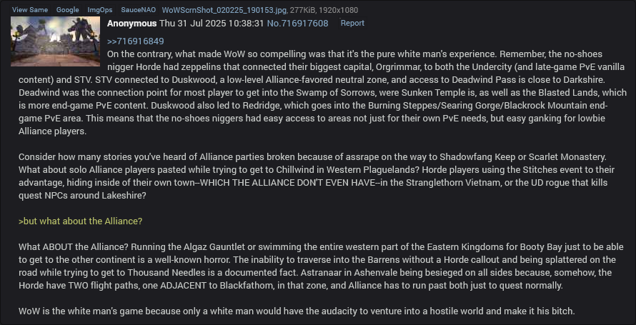 >>732667882This. You look at the top "classic" streamers and they are spamming dungeons and the excuse they use is "i do all the quests at 70 for epic mount gold" okay thats still min maxing the game to the enth degree to suck all the enjoyment out of it. Without fail the Classic community finds a way to min max the fuck out of the game. Similarly to Anniversary, im personally a fan of GDKP's having seen how they work on Era, so when i saw them banned i knew the community would come up with some other bullshit to circumvent actually raiding with a guild and using a fair loot system. Now we have people paying gold outside the game or RMT over discord for items or people hard rezzing all the big ticket items, leaving casual players in an even worse position. the only genuine "classic" feel i had was playing on private servers where admins actually gave a fuck and made changes quickly before certain things got too out of hand. Nublizz doesnt give two fucks.im gonna play the shit out of Classic+ though