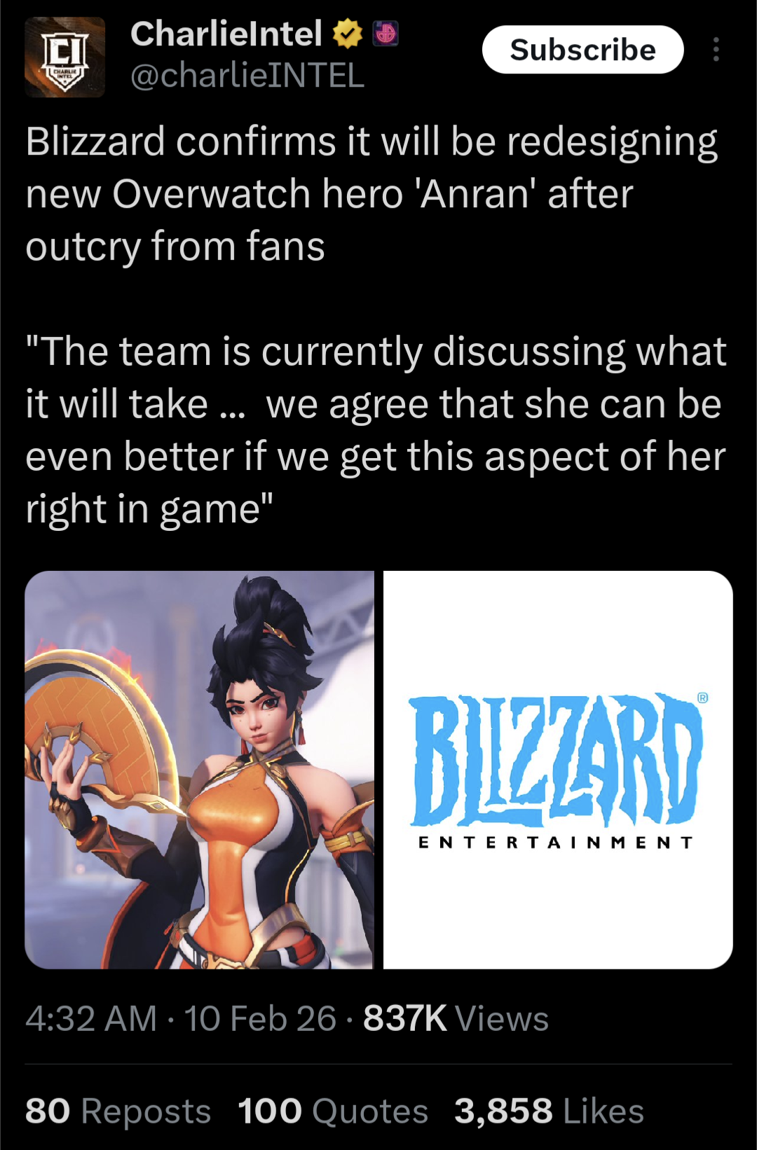 Didn't they just backtrack on one of the announced characters because the VA dyke had an issue with the female character being too feminine? You would have to pay me to play anything made by Blizzard in 2026. Fuck this company, literally as bad if not worse than EA and Ubisoft.