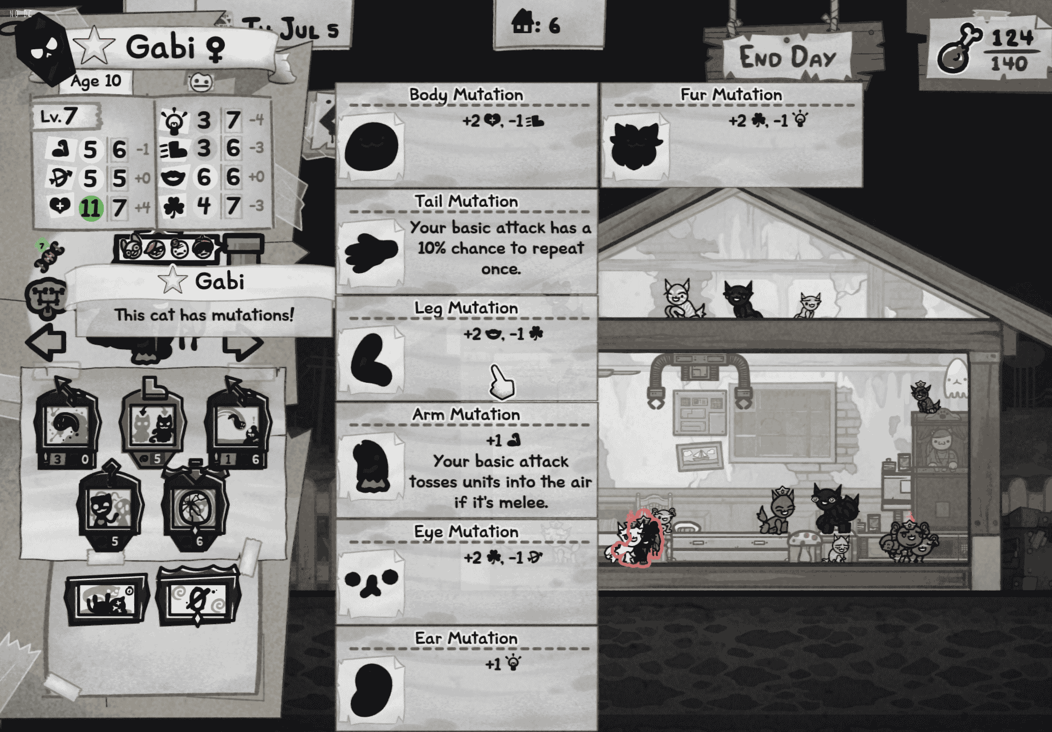 So if you're doing really godawful and run out of deployable cats and near all your food, the game just gives you like four random strays after passing a day