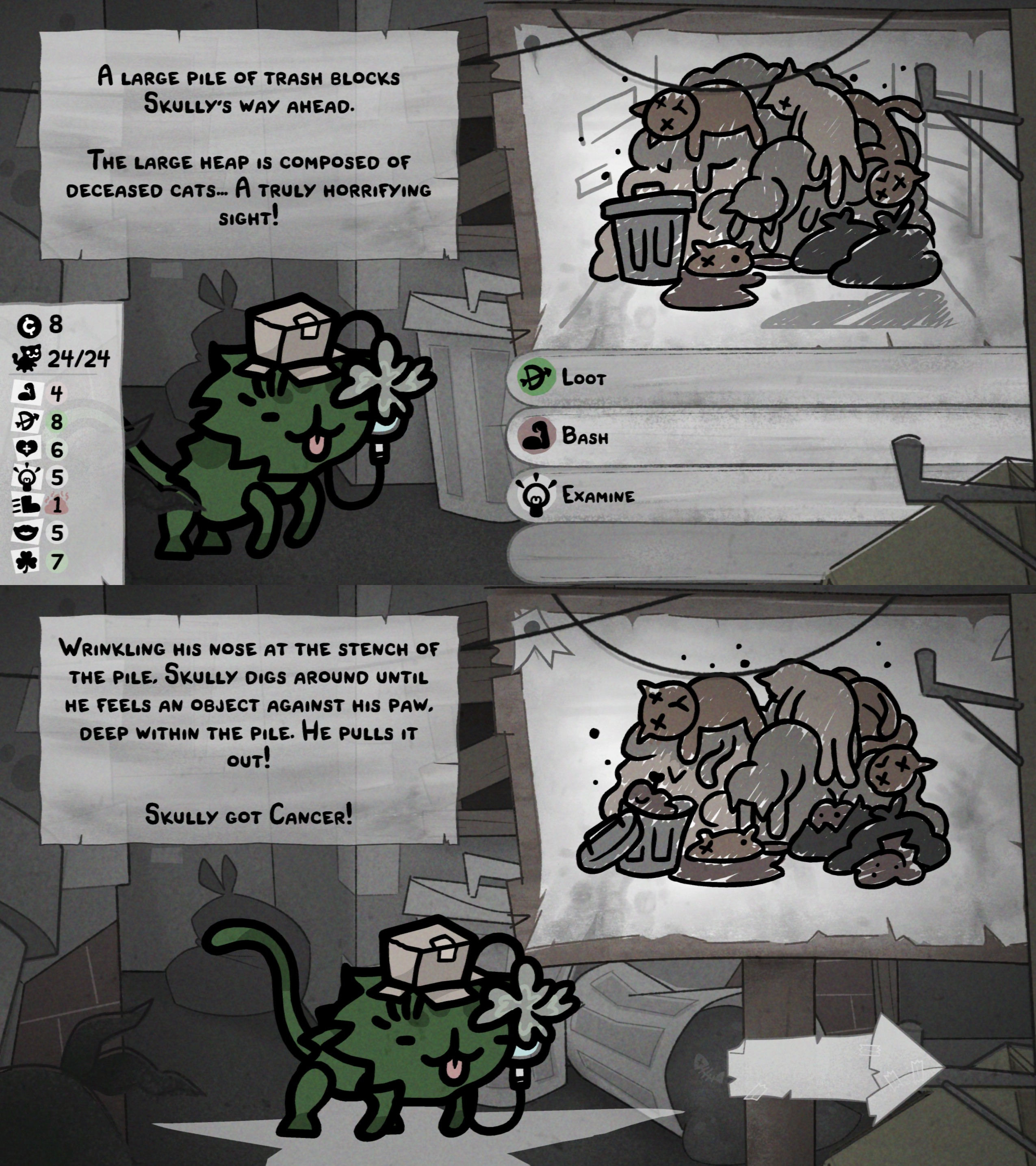 I got this event in my first few days, and I'm really, really wondering how it's going to warp my first playthrough. Cancer gives -3 random stats after every battle and then a random mutation. Mutations are almost always better than not, but the highly-irradiated cats will likely have relatively crappy stat inheritance. All the same, I'm going to try to speedrun making crawling The Thing horrors.