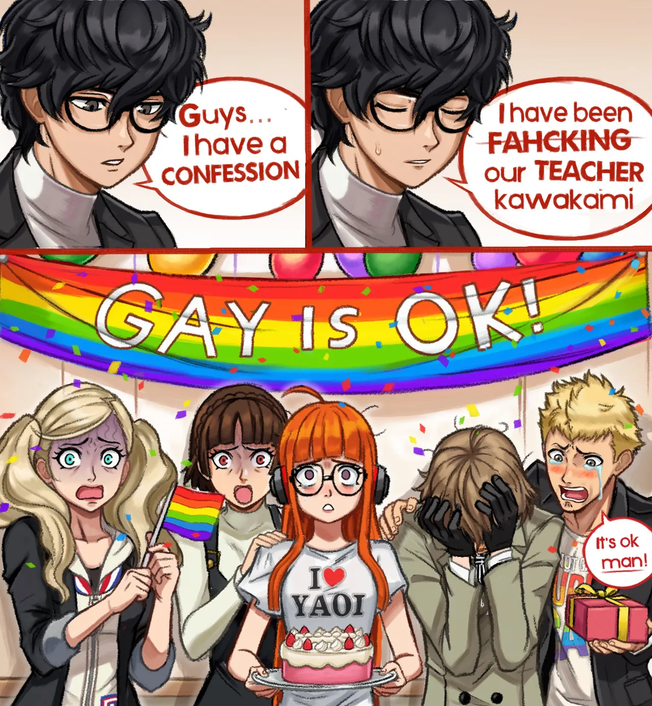 >>732757283Can't fucking believe Ryuji isn't wearing that "HOMO RULES" t-shirt in this