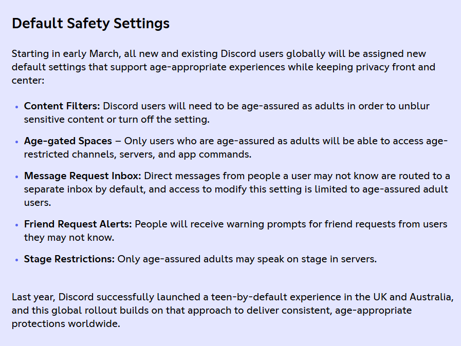 >Teens (especially pre-teens) should never ever have free access to porn in a social setting with it being dispensed by "gooner" degenerate adults.>Grooming is never a good thing and should be handled (even if its by AI) as such>It's Discord it was never private in the first place.>Discord is (was? idgaf) owned by furries (someone tell me if this is still the case or if it got sold off) it deserves to fail if anything.That being said I will not upload my ID or face to it, as I have no reason to even stay on there except for the one or two friends or so I talk to every now and then.
