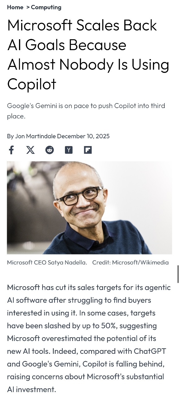 >>732761486Microsoft is already pulling back after failing to secure a userbase for Copilot, despite the fact that they have essentially monopolised the consumer computer market and forced Copilot onto all Windows 11 machines.