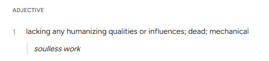 >>732771875>>732771947>look up definition of money and life>ohh thats cool>look up definition of soulless>it definitionally doesn't apply to 99% of games people apply it toIf this is what soulless means, then by definition any game that doesn't use AI generative assets or work cannot be considered soulless. If human beings created it, it has soul. And if you try claiming that humans didn't create it because they needed computers to program it, then fine, but that also means by definition no video game can ever be considered soulful, even games from the 80s and 90s. The only games that can be considered soulful are board games, but even then those are still mass produced using machinery.
