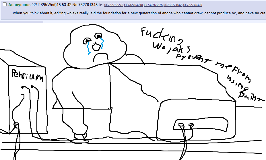 when you think about it, editing wojaks really laid the foundation for a new generation of anons who cannot draw, cannot produce oc, and have no creative spark. the perfect sort who sit there pumping out dalle crap all day