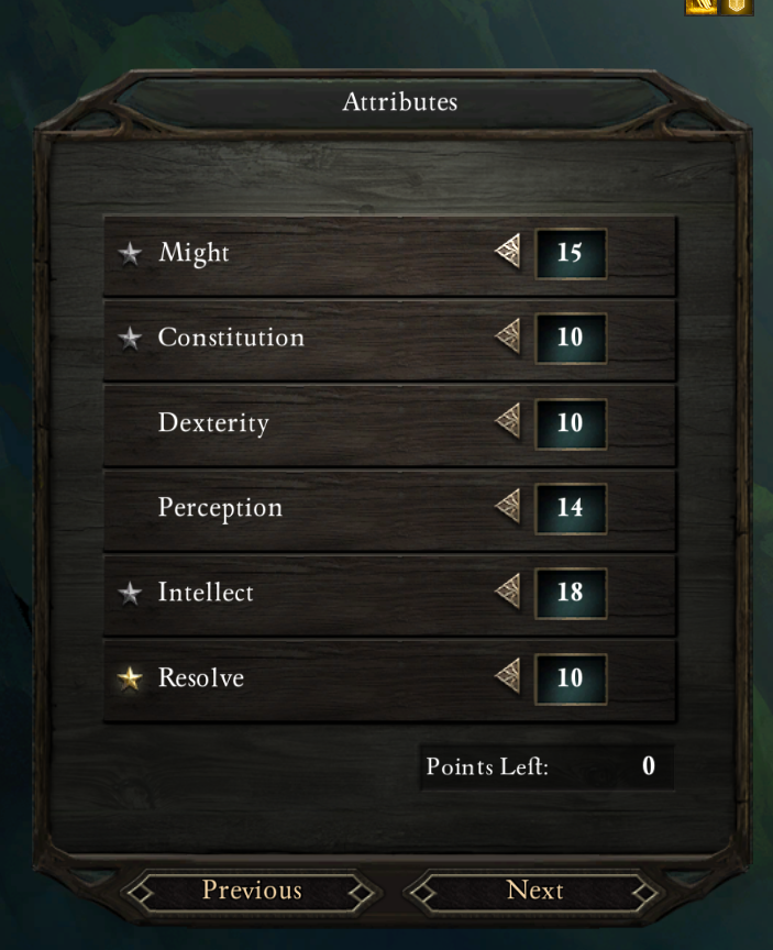 Don't click on NPCs with the golden names. They are kickstarter rewards for donators and have some bullshit special OC backstory that doesn't matter for you and your playthrough.It's a fantastic, long and sometimes dry game. Elegant game design, beautiful backgrounds, some great writing and characters, but can also be wordy at times. You don't need to read all the lore to know what's going on.The character creation itself should help you with what your class should be good at. No reason to powergame here. When it comes to races and backgrounds, you can basically take whatever sounds cool or seems to make sense.Dexterity affects action speed. It's not that important for some classes, but it's rarely something you want to ignore entirely. If you care about that: Intellect and Resolve often also often give additional choices during dialogue.In general, kinda depends on what class you want to play.Also, you get a fighter, a mage and a cleric early on in the game, should this affect your choice. You can play these classes as well for sure.