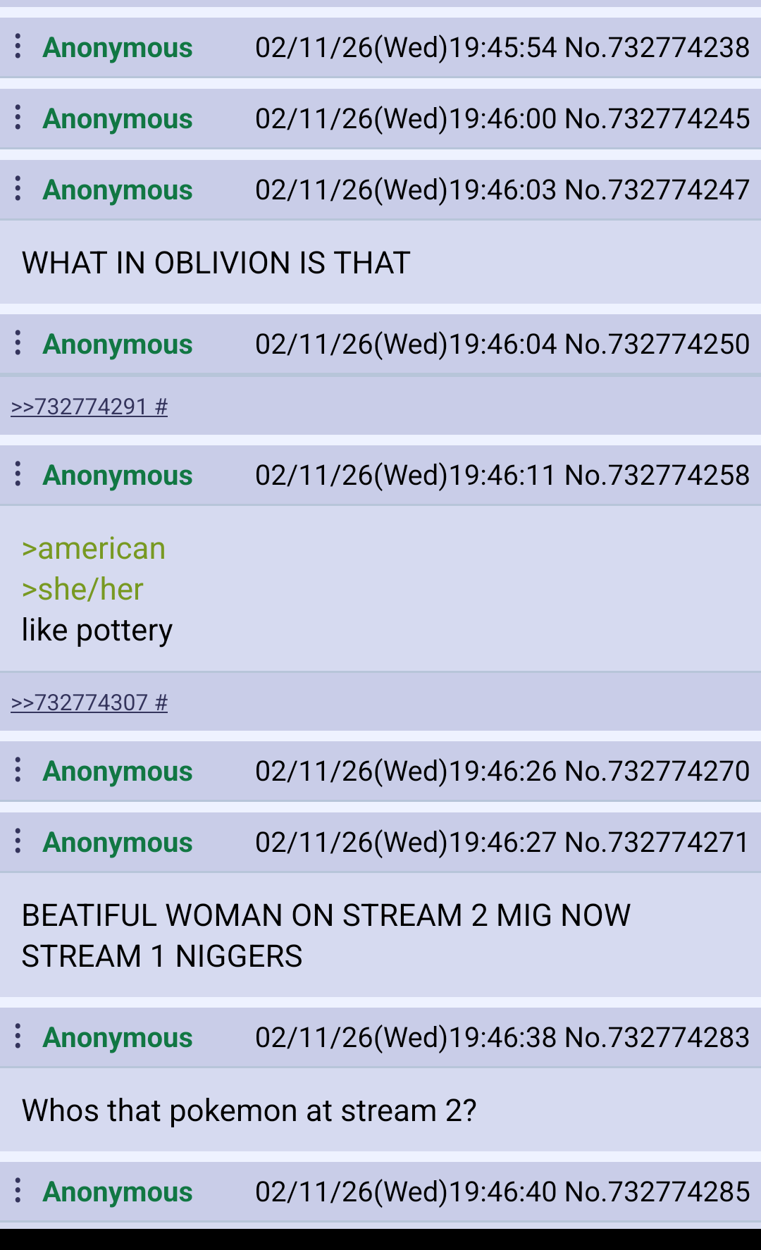 >>732774439There’s one in the previous thread but you do not want to watch stream 2 right now