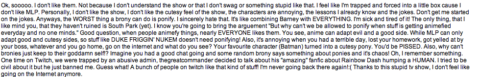>>732781327>the ones I'm into have MLP shower curtains like Corpulent Brony has!YOU'LL BE MURDERED IN COLD BLOOD