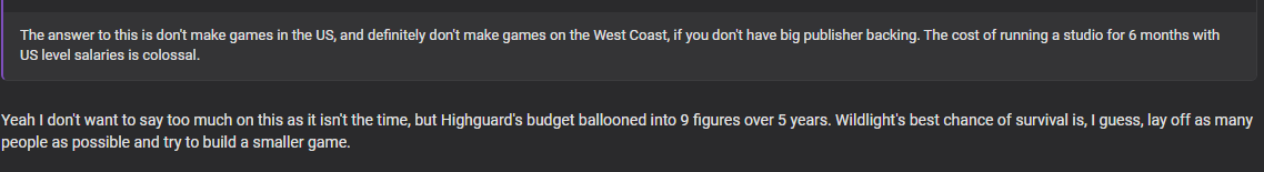 >>73280512750 devs * $100k salary * 5 years = $25 million that's a quarter way to the 9-figure mark on payroll alone using very conservative estimates (some rumors say highguard had 100 devs) As for why the development teams has gotten so large and the development cycle has gotten so long that's a trend across all of software. Personally I think it's a mixture of anti-meritocratic hiring practices, the transfer to ideology-driven 'agile' development rather than efficient, common-sense waterfall development, and lack of cause for passion