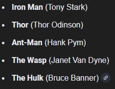 >AvengersIron Man, Cap America, Hulk, Sentry>Future FoundationSpiderman (they're hiding his real default costume which is his FF suit), Invisible Woman, The Thing, The Human Torch>Champions (will just be a mix of young heroes)>Ghost Rider, Ms Marvel, Gwenpool, Miles Morales>VillainsDr Doom, The Maker, Green Goblin, Madame HydraHere's the rest of your roster