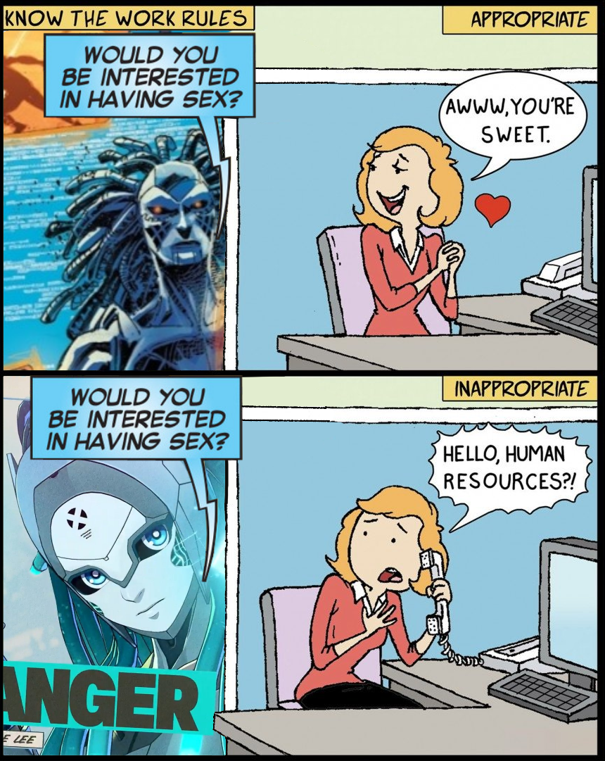 >>732888002If memory serves, Danger asked several characters for sex, most of whom were freaked out. The Scarlet Witch, who has experience fucking robots, did indeed respond with a smile and said "No, but thank you for asking".