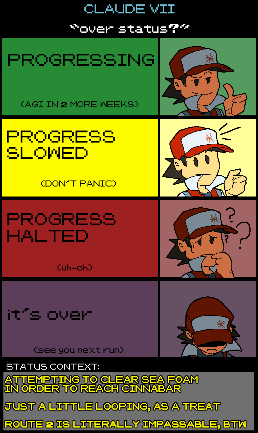 Keep in mind he's teleporting out so he can take Route 21 so he can skip Seafoam. Sure, you have to beat Seafoam (which he did) to get to Route 21.Google is currently trying to fearmonger saying AGI is in 2 weeks so they can save their shares.