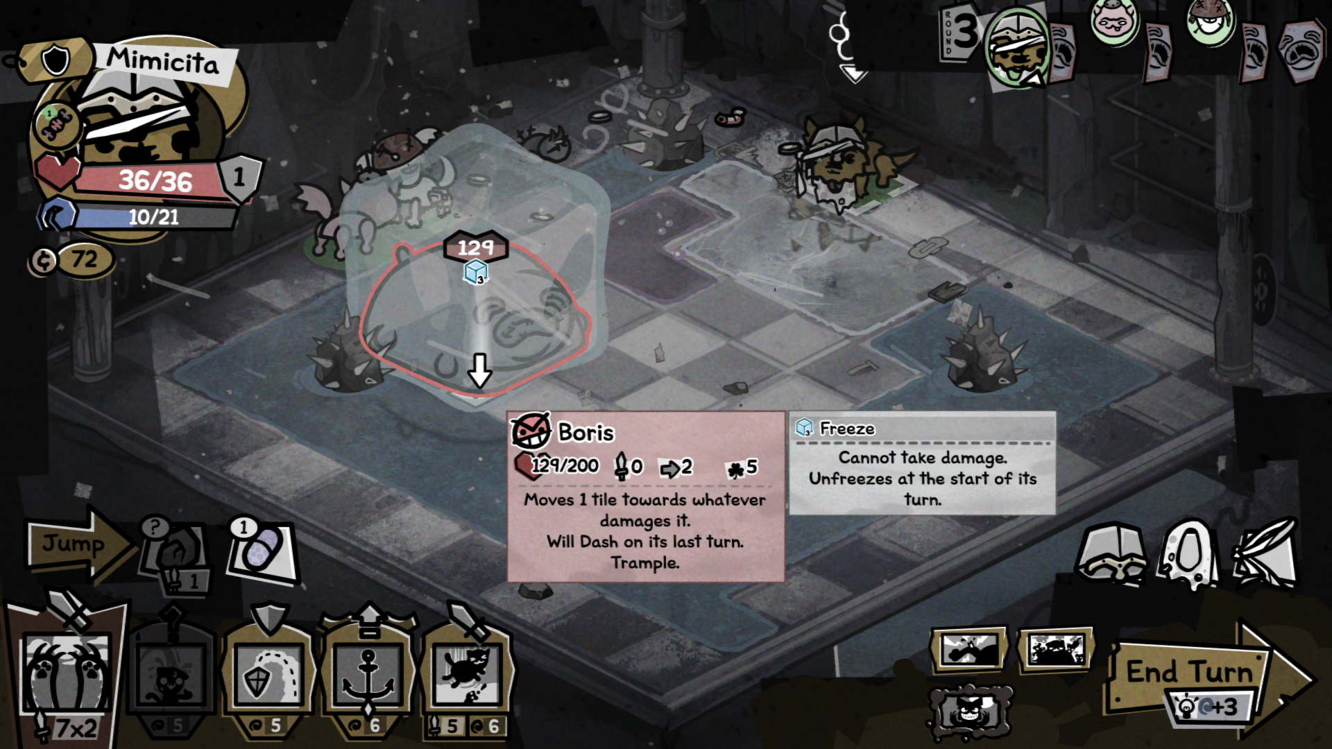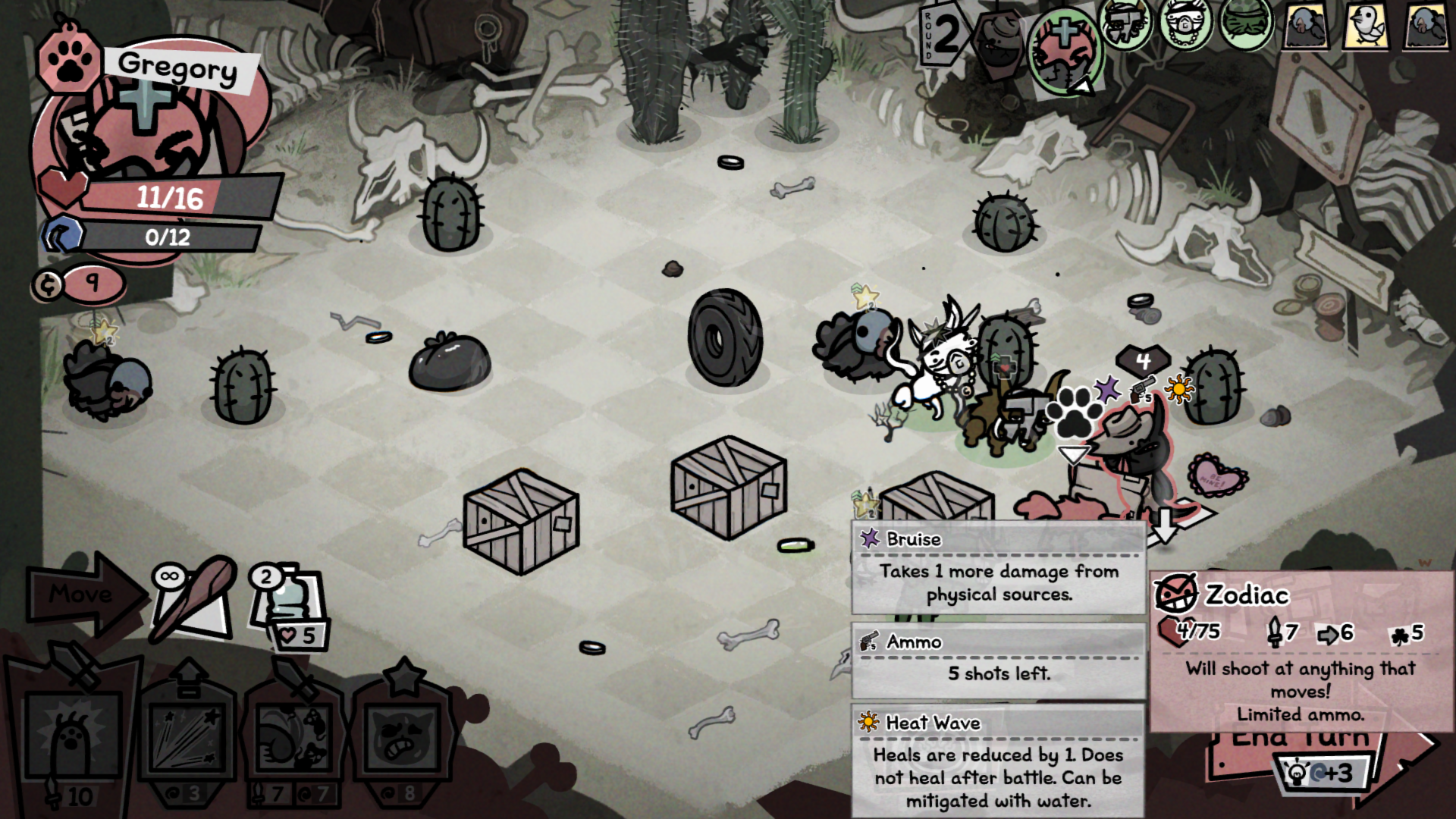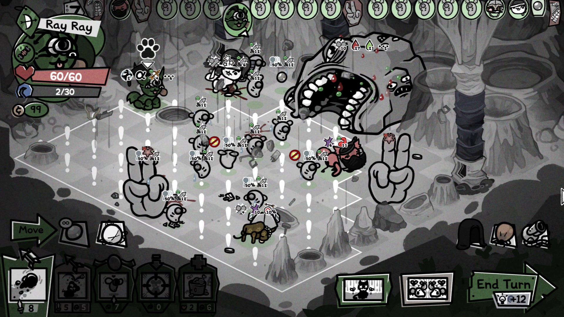 >Heavy Shot (12 DMG/4 Mana): Shoot a high damage lobbed shot with a 70% chance to miss.