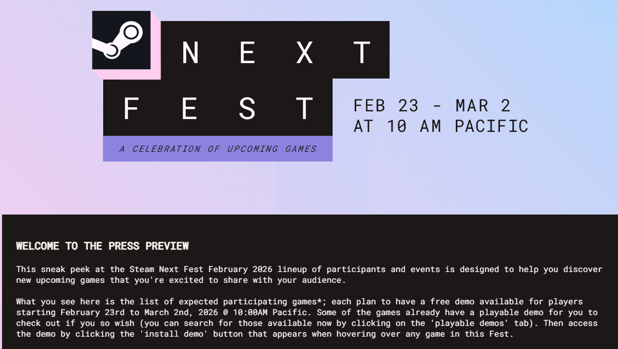 https://store.steampowered.com/sale/nextfest_feb26_pressGame journalists, dumpster divers and particularly agdg developers are welcome to share game demos ITT. No one will judge you here.Previous:>>732851979