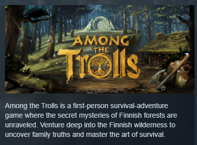 Among the Trolls would've been cool if it wasn't so unpolished. The Forest but Finnish, and with some focus on story where you interact with fae and stuff. Could be good after more dev work but hard to recommend, especially with that ridiculously lengthy intro.https://store.steampowered.com/app/1675260/Among_the_Trolls/