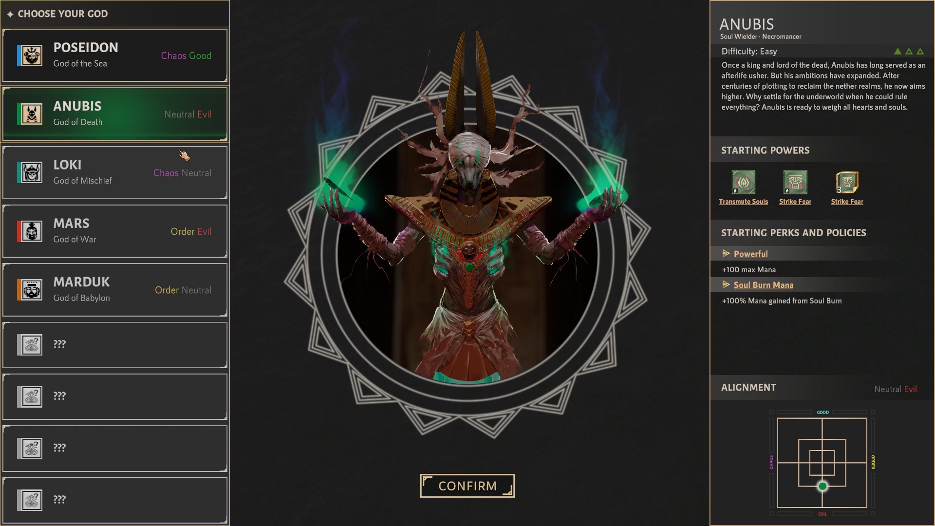 >Anubis neutral evil>Poseidon chaotic good>Ares orderly evilI want to strangle whoever made this. At least the game itself is addictive. Real time grand-strategy where you go big by using your divine powers, commanding your priests and doing quests from mortal. Although easy the most annoying thing is that you can get quest you can't complete because you don't have right power unlocked.https://store.steampowered.com/app/2229910/Demiurgos/