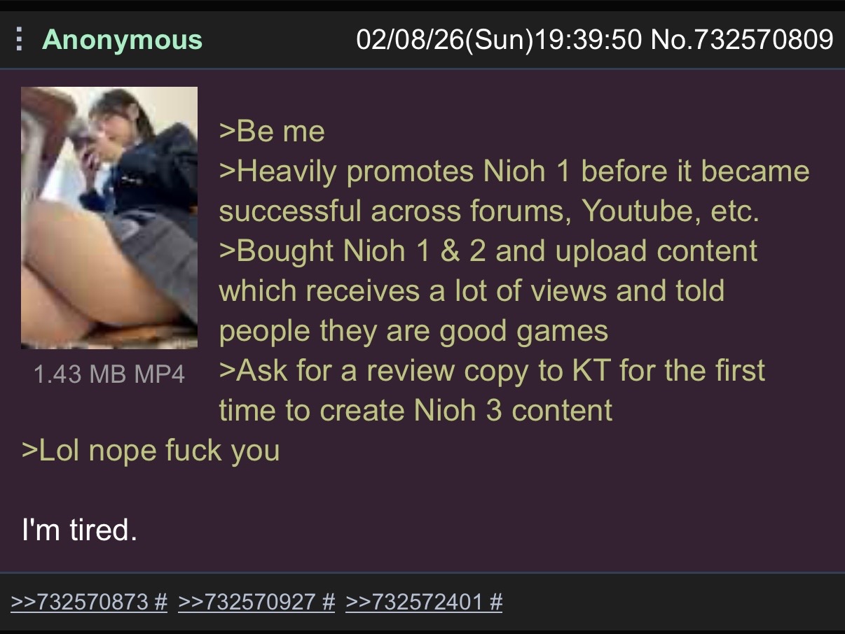 >>733016605No, OP called Niohfags paid shills. The image shows Anon did it for free, and the faggot thought he was entitled to a free copy of Nioh 3. KT told him to fuck off.