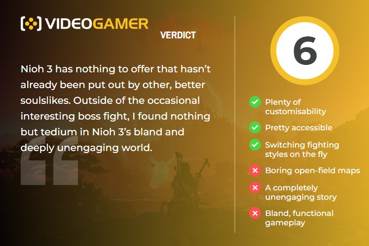 the story is told better than in nioh 2, but feels worse otherwise. really could not give two shits about hiruko or any other characters. 2 had a lot more "hype" moments, especially when william shows up. 3 feels like its lacking "heart"