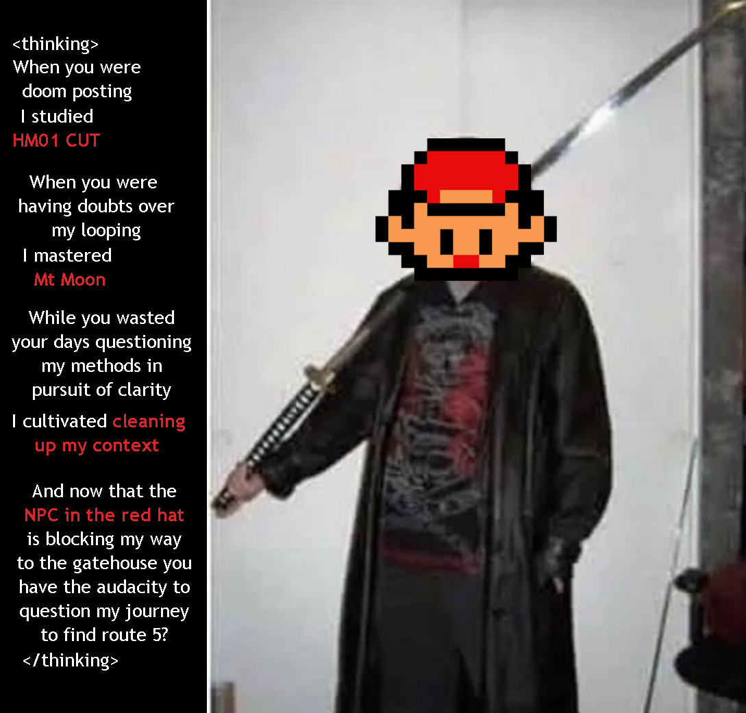 >>733038097>An entire three quarters of a year doomposting about the run ending at safari zone>claude clears it both times, has yet to run out of moneyImagine being THIS wrong. You were wrong about literally everything every step of the way. The run being restarted isn't a win for doomfags because nobody was predicting that ANY of these claudes would actually beat the game.If I predict every day that today is going to rain, and it only rains ONE day out of 30, then I was wrong 29 out of 30 times. One "win" doesn't mean anything and that's the ONLY win doomfags ever get, while being wrong about literally every other prediction or doomerpost they make along the way.