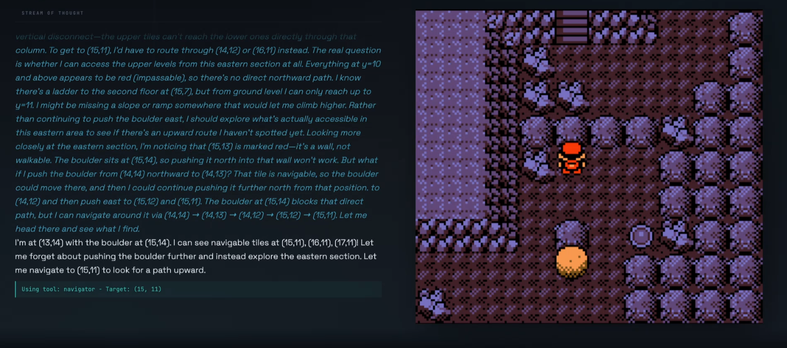 >>733070973>I've entered Victory Road, let me get a look at my surroundings...>The RAM state shows that tiles to the north are cyan (not yet navigable), but my notes say a switch to the east opens them, let me make my way there to check this.>EXCELLENT, after standing on the switch, the tiles previously shown in cyan are now navigable! This confirms what my notes say, standing on this switch is absolutely the solution to this puzzle, let my modify my files to contain this monumental breakthrough...>This is strange, once I moved away from the switch, the path that opened is shown in cyan again. Perhaps I moved in the wrong direction, or I should have stayed on the switch for longer. I'll use DIG to escape and reset the switch state, the reenter with a fresh new approach.>I've entered Victory Road, let me get a look at my surroundings...