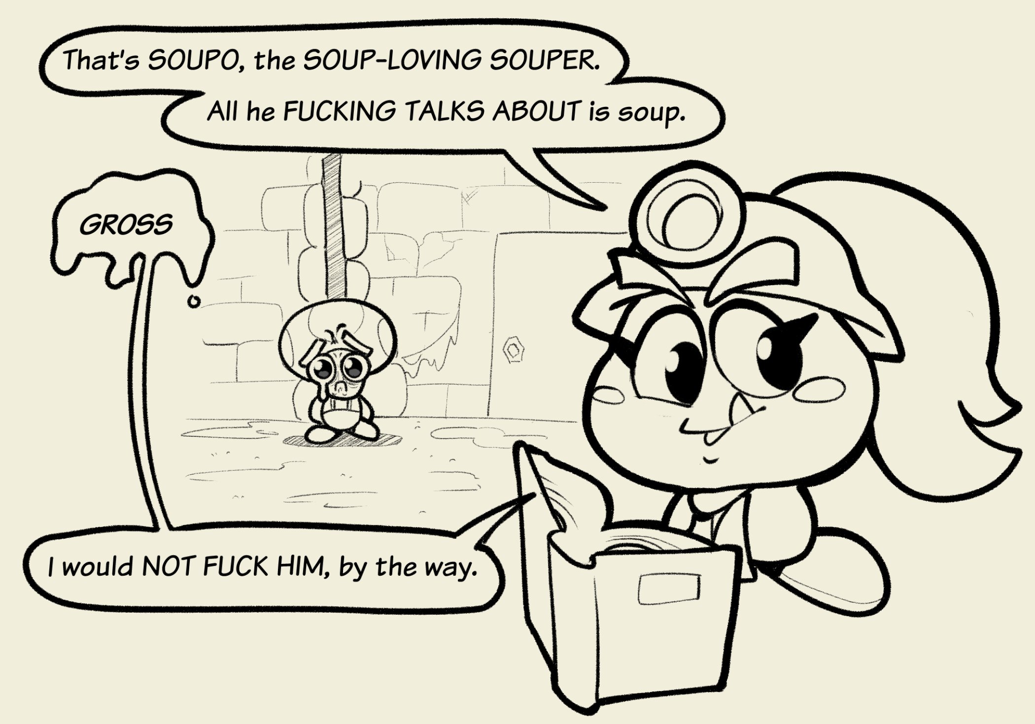 >>733064625Paper Mario TTYD is wish fulfilment. Who doesn't want a witty and hot young college student who's really into you following you around 24/7 as you go on an aventure together? Especially since the field tattle mechanic means you're constantly hearing from her and getting her input and reactions to everything the whole time. Lots of RPGs just straight up do not sell this aspect of going on an adventure because the devs are too lazy to write bespoke dialogue for your companions to say regarding every single NPC and every single room and specific location. TTYD did and it makes all the difference. Goombella feels way more real than the perpetually silent and unreactive statues that are your party members in every other RPG.