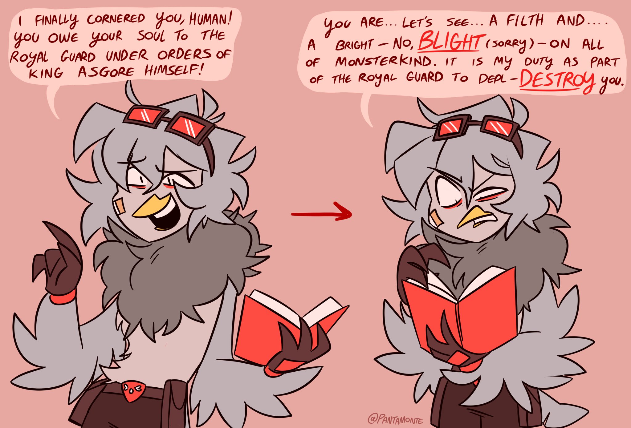 Not to reignite any flame wars here, but out of curiosity I decided to check out how many times Martlet "makes mistakes" in regards to looking after Clover, and surprising, she hasn't really made that many In Pacifist.For all the talk that Martlet is a huge screw up, she hasn't actually made that many screw ups, and outside of the whole aviator situation, she's actually been pretty competent when it came to looking after Clover. All the scenario's after the boat accident were either from situations outside of her control, or understandable circumstance where she prioritised Clover's well being in the moment, which resulted in her forgetting other things, rather than simple negligence.She already broke protocol when she decided to side with Clover in Snowdin, and had already admitted she's probably going to lose her job for choosing to keep a human safe, so the idea of her using her Royal Guard status to do anything was already addressed.Which is also leads into the next point, where when she meets Clover again, she was in a panic about whether he was safe and rushed to where he was, yet was competent enough to stop herself from getting monsters to help, because she realized she's be questioned, and like lead to the Royal Guard being alerted to Clover's presence.The Feisty Five basically ambushed Martlet and Clover, and kidnapped him in the moment. That's not really Martlet's fault. Yeah she forget her Royal Guard badge, which was already addressed in the previous point. She panicked and prioritised Clover's wellbeing, and never planned on using her Royal Guard status to do anything, since she was trying to be discreet about Clover from the get go.Leaving Clover alone with Ceroba? Again not really Martlet's fault, and this was addressed. She had to return to Royal Guard and clock in or they'd get suspicious of her disappearance. Otherwise she would have stayed with Clover. Not to mention Ceroba duped everyone, and hid her true intentions.
