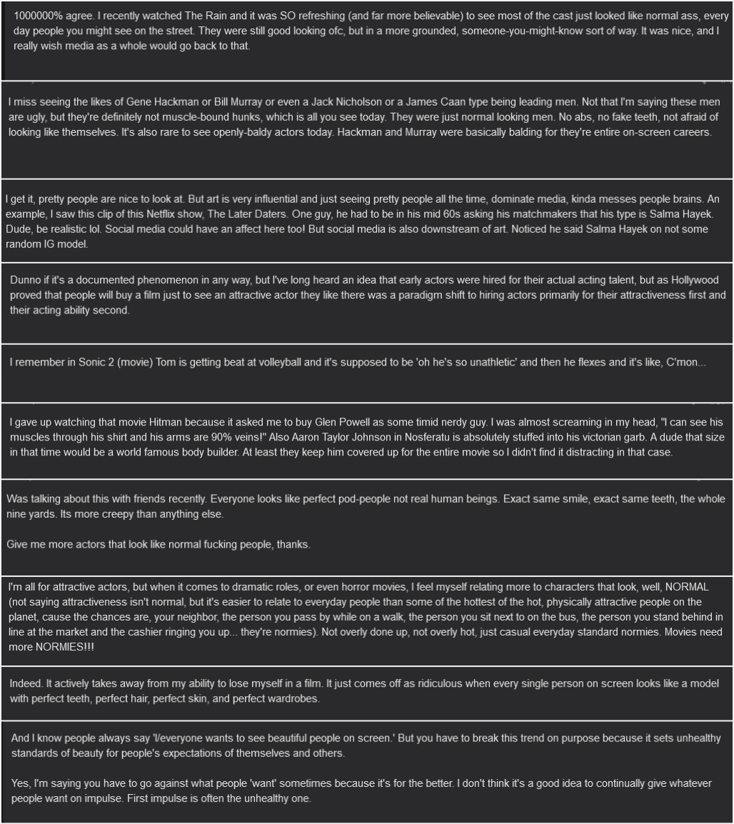 >>733138979>>733138917Yep, every questionable thing in media regarding women is dictating by the sexual competitive nature of women, except for a small portion that is a result of homosexual men in the fashion industry.This is why the most common "ideals" in porn art don't reflect the ideals of the porn industry in the 80's/90's pre amateur era. Why ideal models aren't actually that hot aside from having good faces.Men are constantly deprived of what they want.