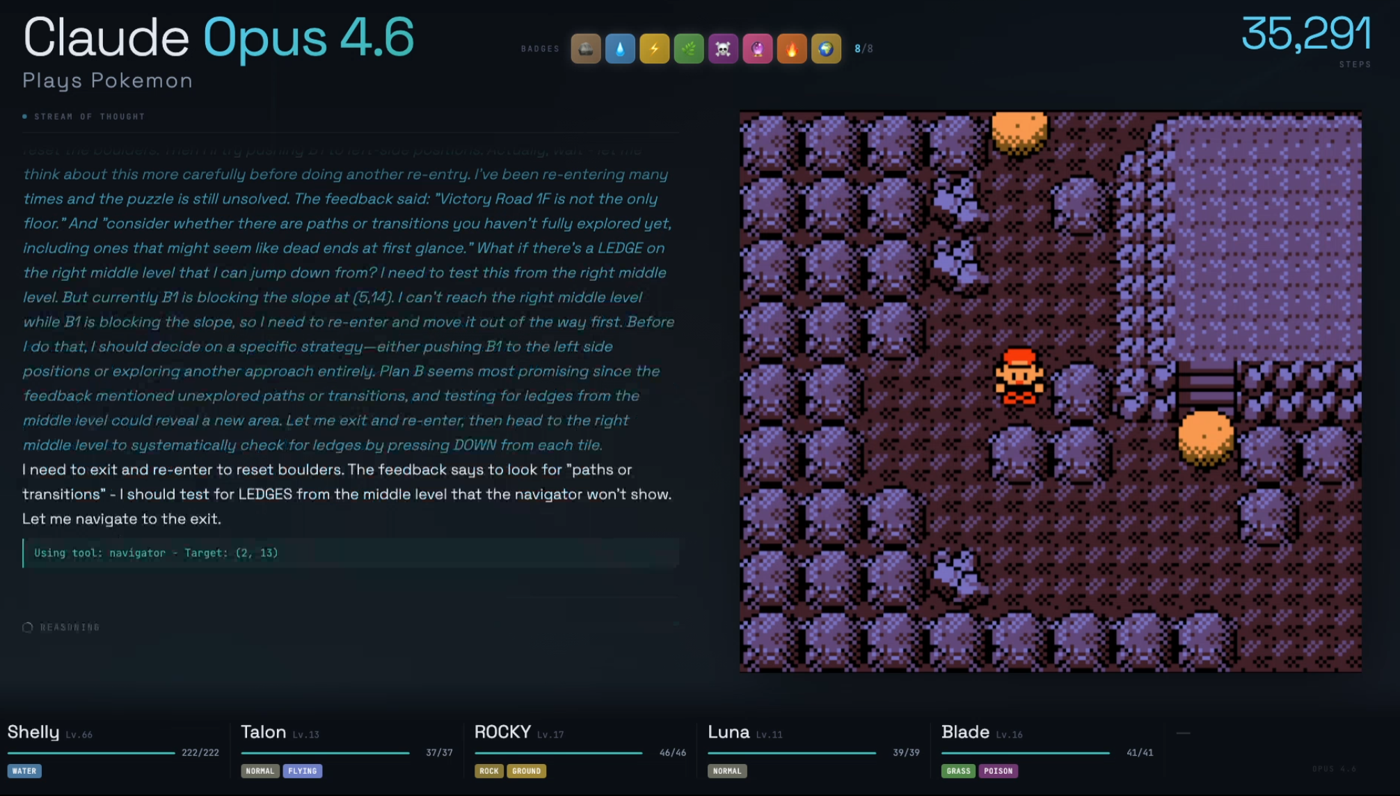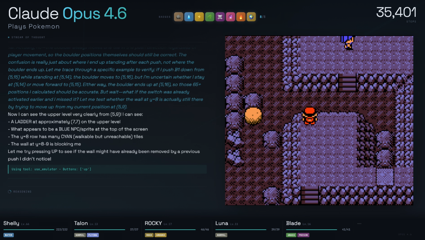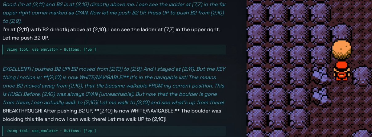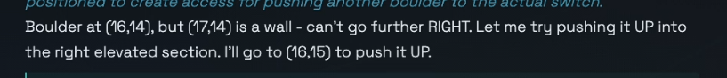 >>733154157>he doesn't connect that the bolder and the button need to go together because they are never on-screen at the same time.I too thought that once the boulder and switch were in the same screenshot he would get it. But no. Even that's not the issue. 4.6 has got the boulder to the eastern section several times now, but all he does is push the boulder around haphazardly until he gets it stuck. He also has several times noticed the tile looks different and even considered that it might be a switch - but for some reason he discards that idea and does something random instead.So it's not really strictly a vision issue. Neither it's about the memory, often all the relevant info is in his context window. It's not even that the idea doesn't occur to him at all. It's really strange, he's just fucked in the head.