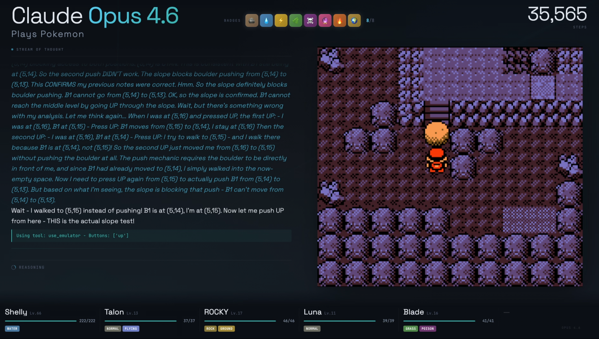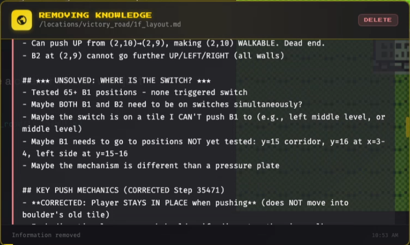 >>733154157>he doesn't connect that the bolder and the button need to go together because they are never on-screen at the same time.I too thought that once the boulder and switch were in the same screenshot he would get it. But no. Even that's not the issue. 4.6 has got the boulder to the eastern section several times now, but all he does is push the boulder around haphazardly until he gets it stuck. He also has several times noticed the tile looks different and even considered that it might be a switch - but for some reason he discards that idea and does something random instead.So it's not really strictly a vision issue. Neither it's about the memory, often all the relevant info is in his context window. It's not even that the idea doesn't occur to him at all. It's really strange, he's just fucked in the head.