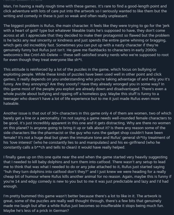 >>733149608There was a Deponia thread recently and almost every post sounded like it was ripped straight from Reddit. If you haven't played it, the main character is a parody of adventure game protagonists, who have a long tradition of being insane sociopaths who obliviously cause destruction and suffering wherever they go. Every other post was in the vein of this steam review. Just whining about the main character and sexual content. Feels like half of every decently sized board is fags doing their best Reddit impression in every post.