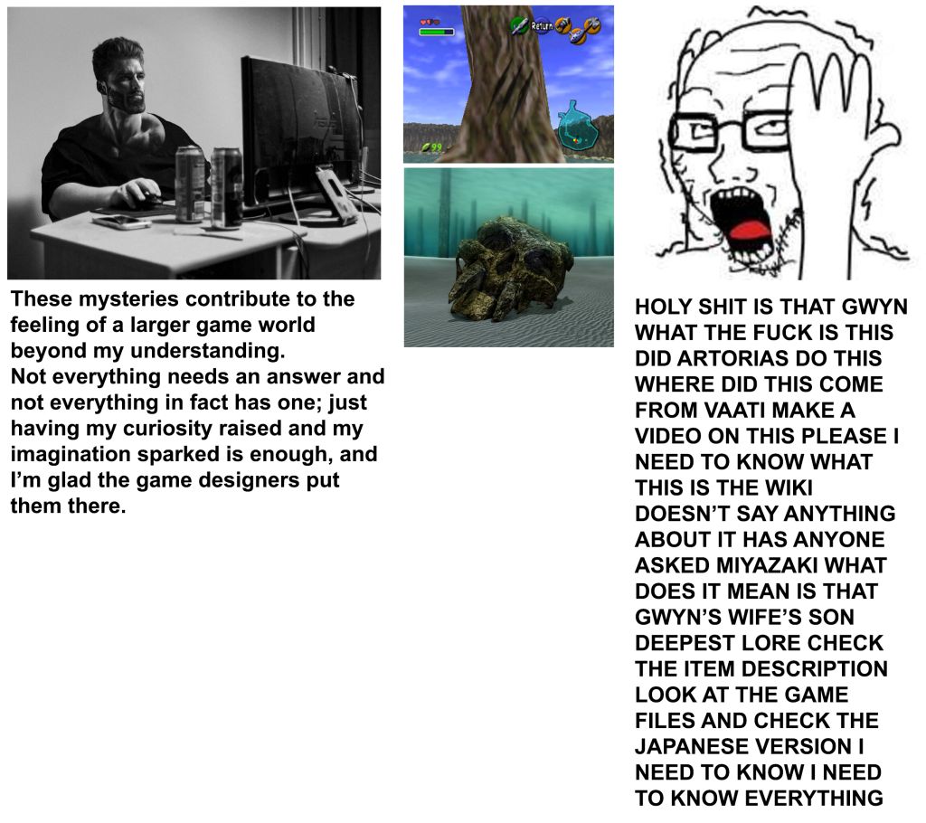I didn't watch a fucking >video essay. I played the game in 2014 when half of you fags were in diapers and, based on my own experiences, formed the opinion that it was dull. Unintentionally dropped it somewhere in the giant castle because I just didn't feel like opening the game again.Sometimes I forget that most of you are <20.