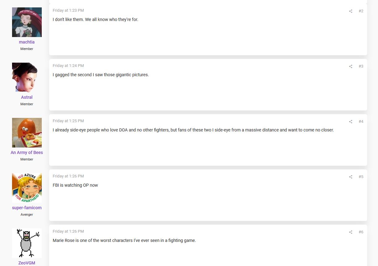 they're not happy about thishttps://www.resetera.com/threads/now-that-dead-or-alive-has-been-confirmed-to-return-what-do-you-think-about-marie-rose-and-honoka.1435609/