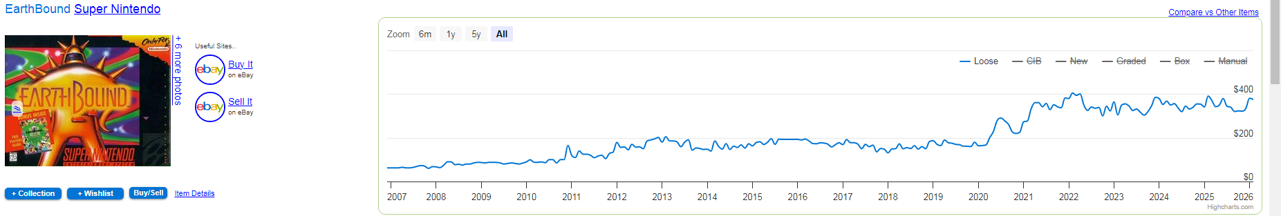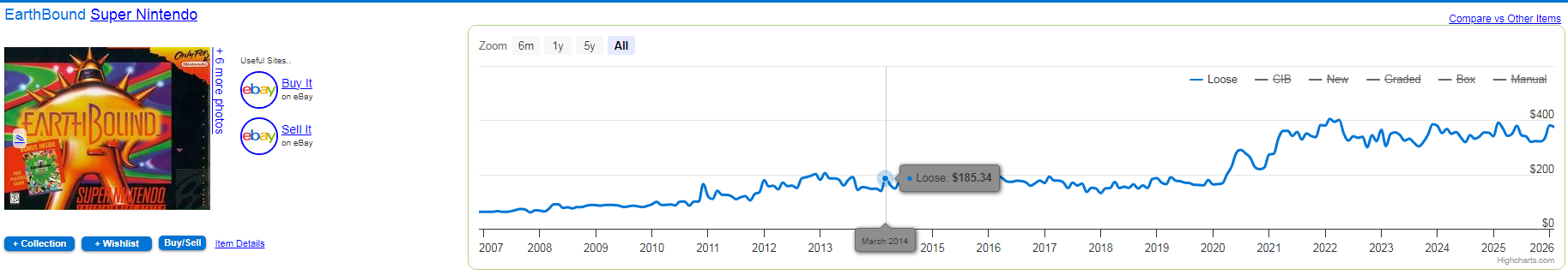 >>733267440>Also notice how this only happened with the popular gamesDepends entirely on the series really. Even mundane stuff like Afrika and the PSN Vol. 1 shot to the moon for no reason because of assholes who made Youtube videos about them during Covid. Now they're like $280. Same deal with Boxboy JP since it came with the Amiibo and all three games. Same deal with Rhythm Heaven Fever just because it had a smaller run than usual on the Wii.I am not a fan of Youtubers during the Covid era who talked about video games, they genuinely ruined the physical space in general because of how much attention they brought to certain games.>>733267508Look at that massive dip in 2014. Wii U Earthbound released in mid 2013.