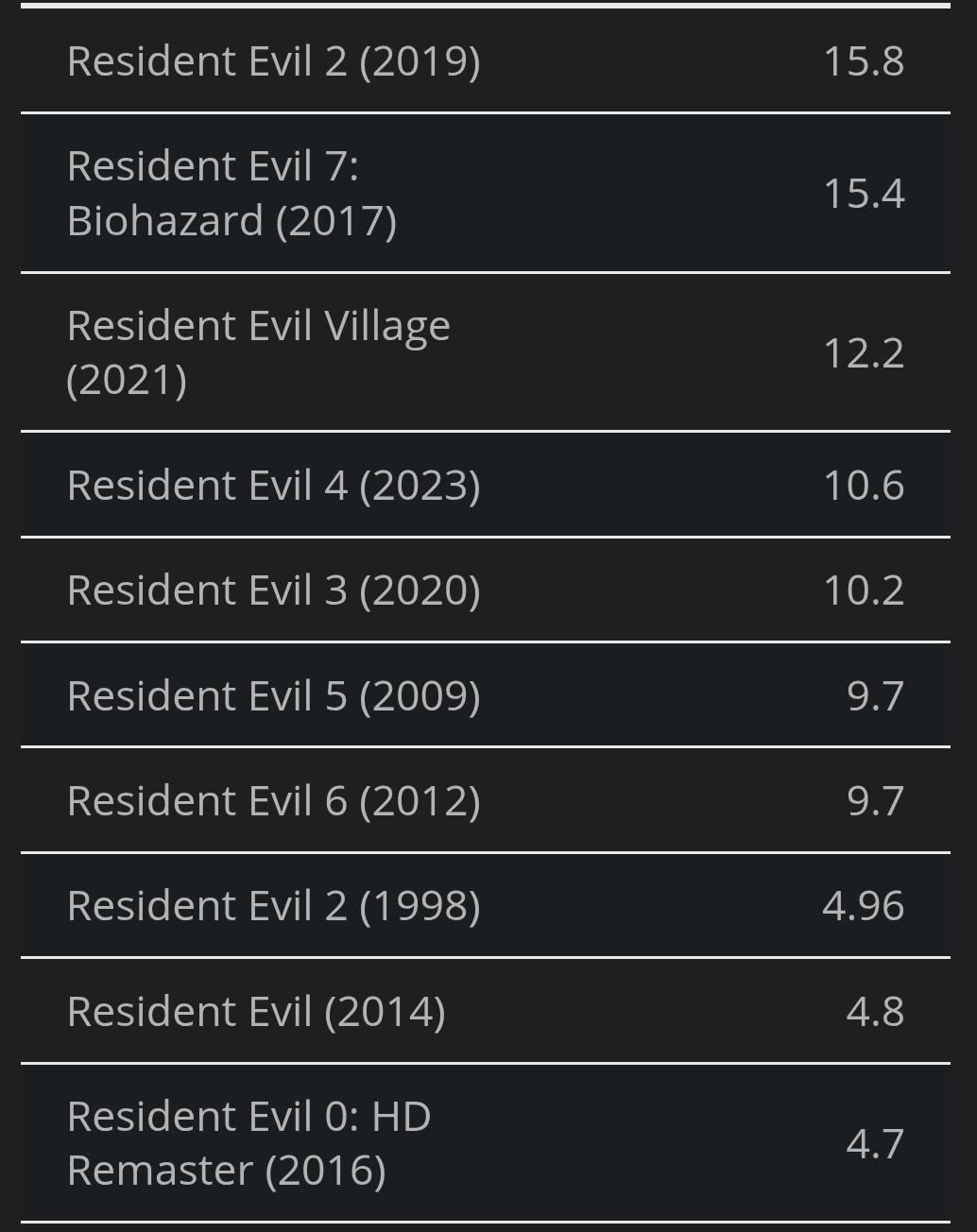 >>733309919>It's the ninth game in a series that peaked five games agoRE4 is when it went to dogshit though, the reason the series is dead is people like you worshipping that turd