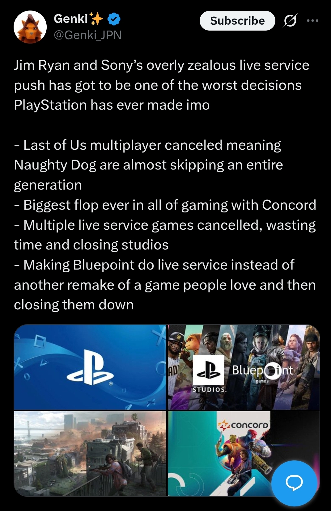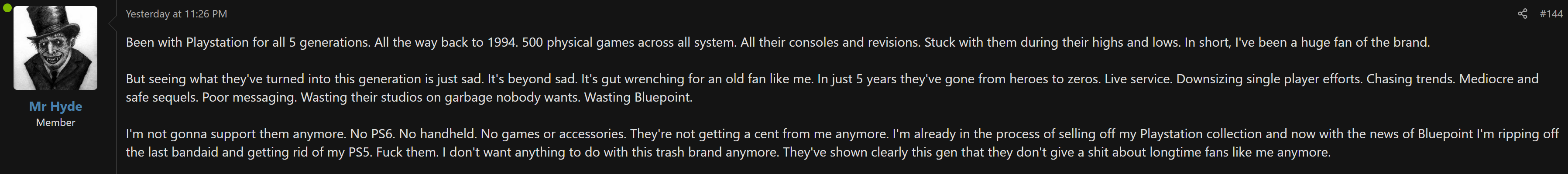 >>733396305It's a mistake for Sony to think that single player studios can just be closed without any consequences. Hardcore PS gamers are dropping the brand completely, seen lots of posts like this one all across social media