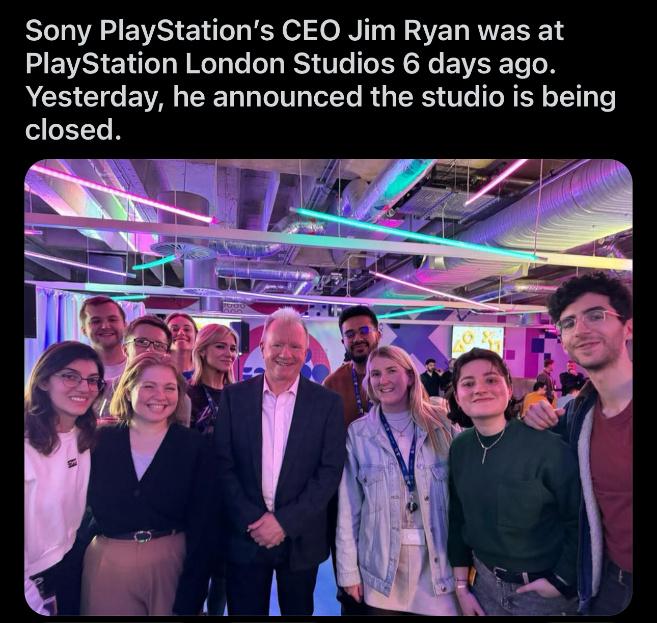 >>733397031>PlayStations Jim Ryan attended a retirement party at London studio 5 days ago.>Today he announced the studios complete shutdown along with 900 jobs900 fucking people, and the last game they put out was 7 years agohow the fuck is this possible? I wonder how many of them were devs and how many middle managment/hr/project manager/lead studio culture